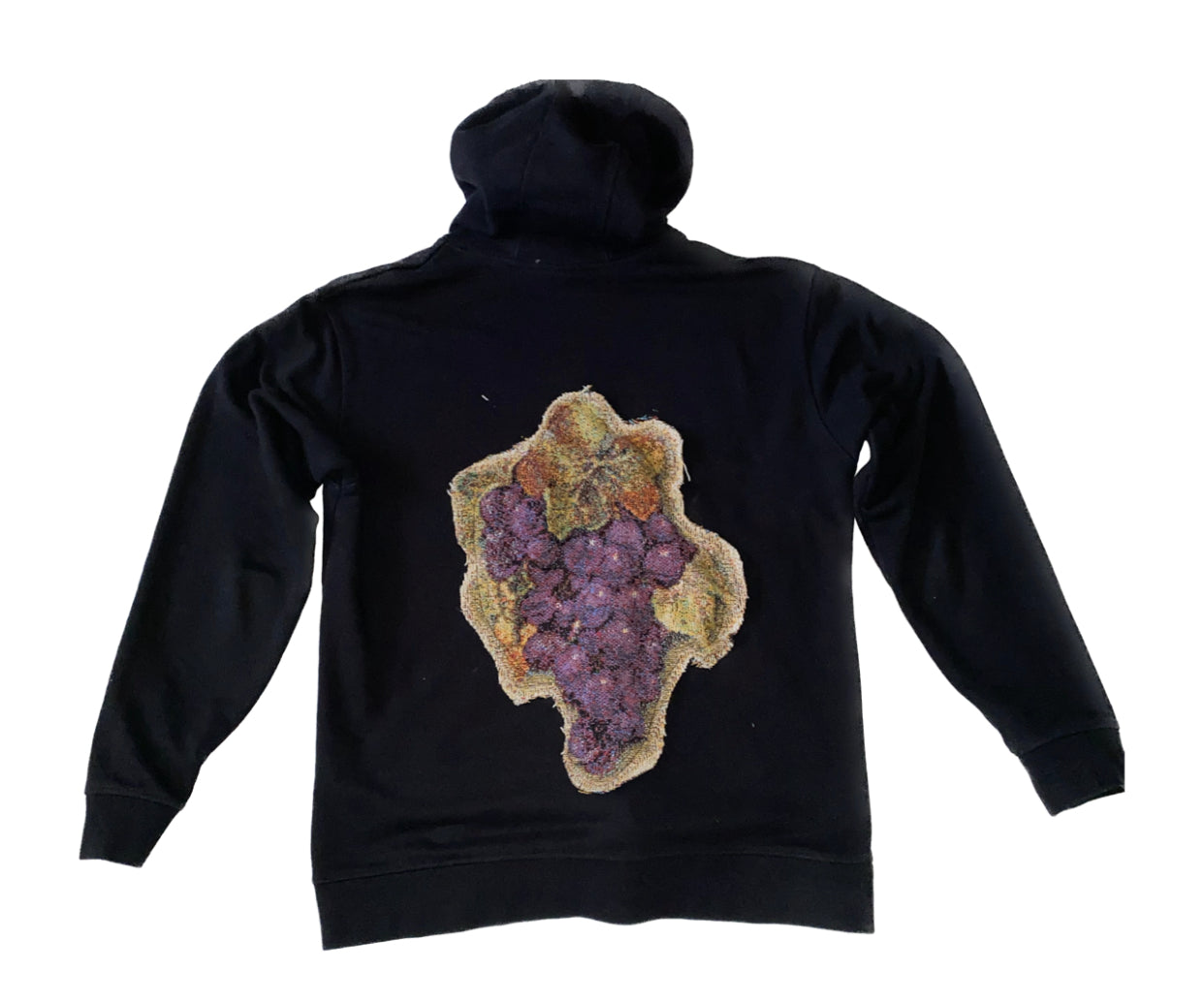 This is a collaborative piece with lots of history. Staple, which was founded by Jeff Staple in 1997 introduced the “flapper dress” which was one of the most iconic looks in the Great Gatsby era. The handcrafted grapes on the back are symbolism of prosperity and abundance, this was believed by the ancient Romans and Greeks.