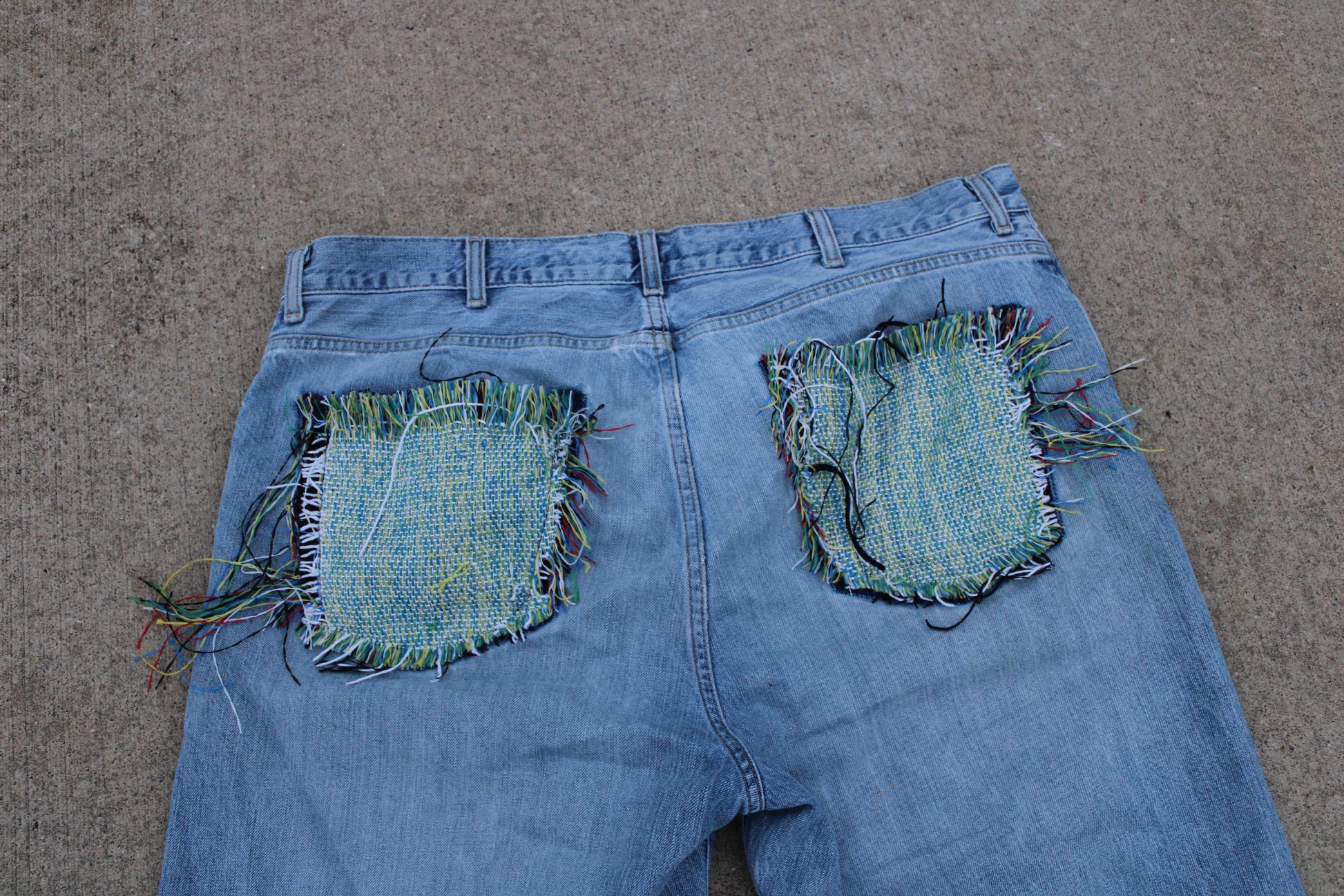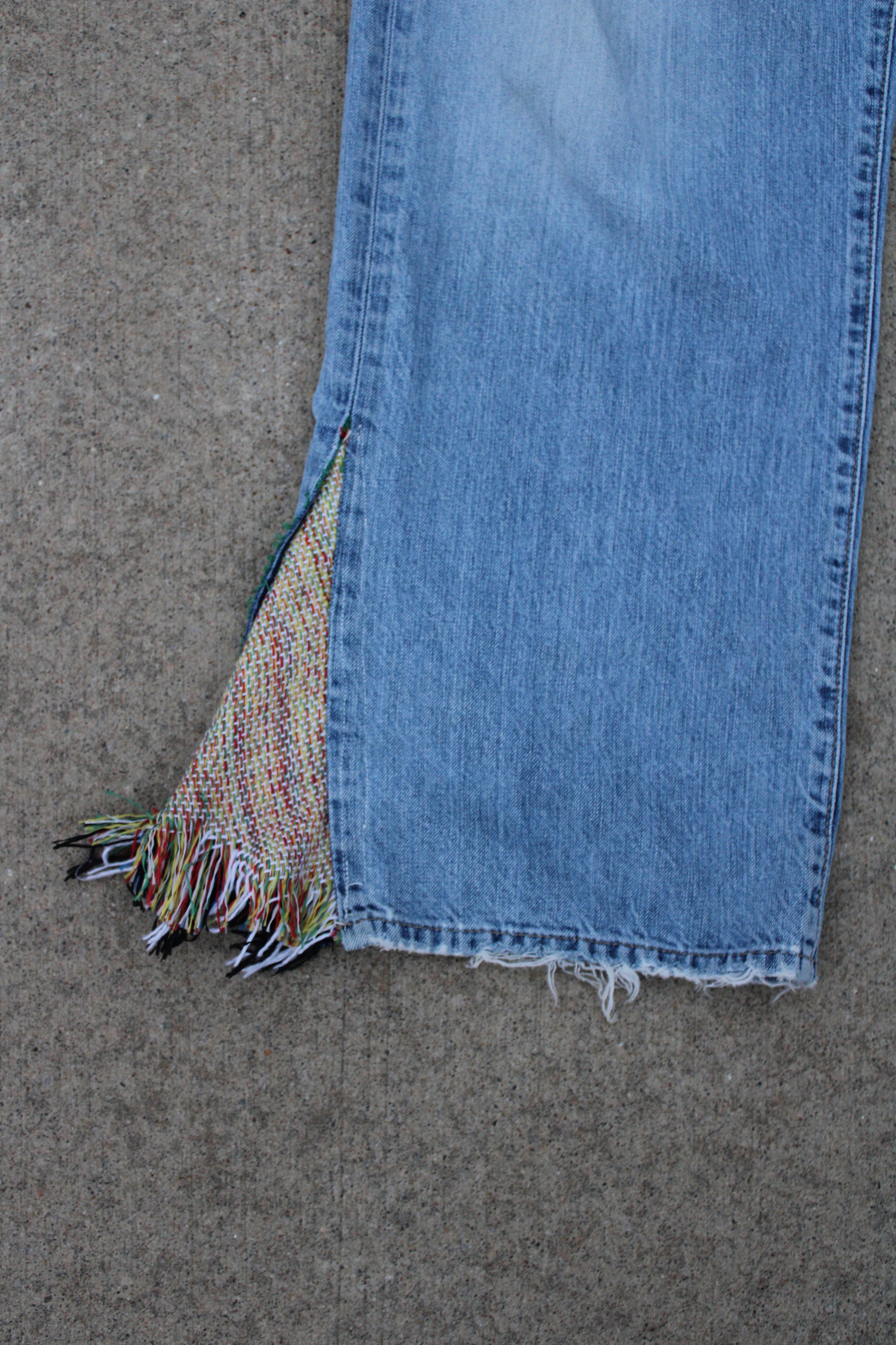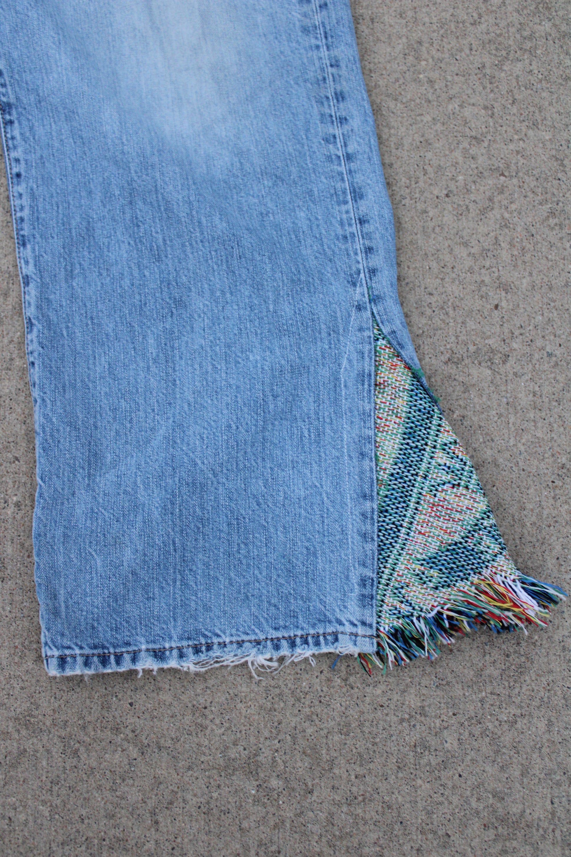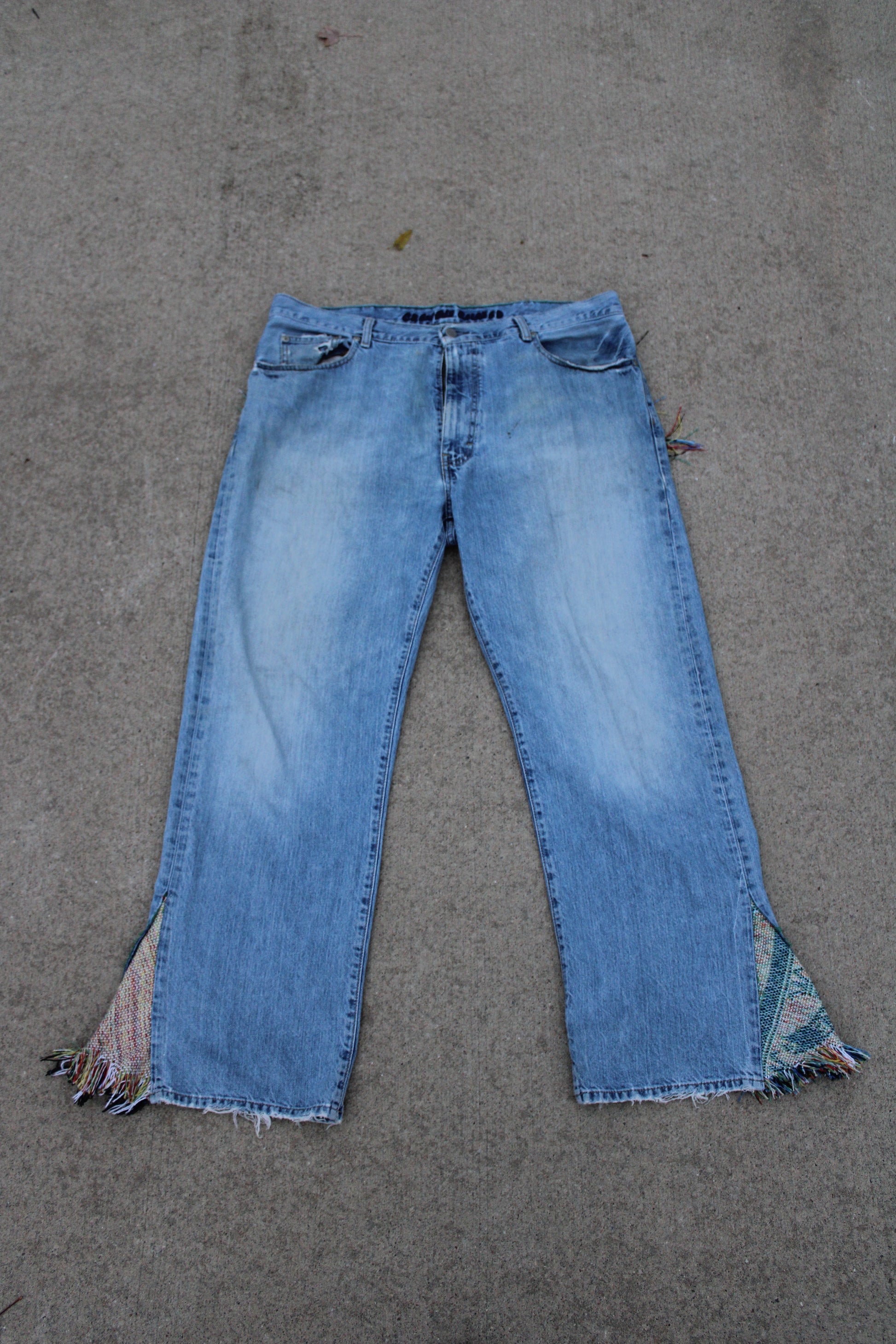 These custom TBKC denim jeans feature a vintage wash with bold personality, highlighted by flared inserts made from textured woven fabric on each leg. The back showcases oversized, frayed patch pockets crafted from the same eclectic material, giving them a rugged, boho vibe. With raw hems and a relaxed fit, these pants blend upcycled charm with unapologetic flair.